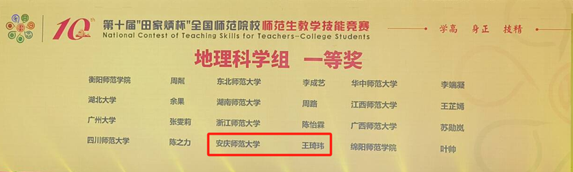 12月1日,第十届"田家炳杯"全国师范院校师范生教学技能竞赛决赛在浙江师范大学圆满落幕。本次大赛共吸引全国250多所师范院校1800余人参加,地理科学专业2022级(1)班王琦玮(指导教师:刘峰)凭借出色的表现荣获全国一等奖。