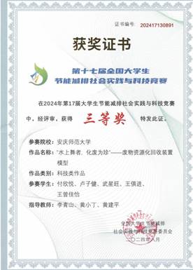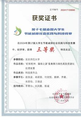 八月,第十七届全国大学生节能减排社会实践与科技竞赛决赛在中国石油大学(华东)圆满落幕。学院赵良波团队作品《“虻转乾坤,藻绿之源”畜禽粪污绿色高效资源化处理装置》(指导教师:李青山、刘凤霞、陈诚)和付欣悦团队作品《“水上舞者,化废为珍”——废物资源化回收装置模型》(指导教师:李青山、黄小丁、黄建平)荣获全国三等奖。