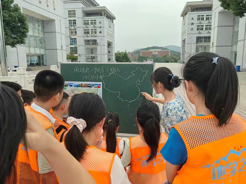 的国旗广场拉开研学的序幕。地理研究生汪雪琴手持画笔,在庄严的国旗下缓缓勾勒出中国地图的轮廓,边绘边讲,深入浅出地阐释了我国国土面积与地貌组成,特别强调了从“横版”到“竖版”地图演进的意义。竖版地图的完整展现,如同一把燃烧的“火炬”,有力宣示了国家主权与领土完整,激发了学员们的国家版图意识和爱国情怀。