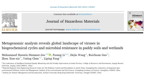土壤污染修复与地力提升团队研究成果“Metagenomic analysis reveals global landscape of viruses in biogeochemical cycles and microbial resistance in paddy soils and wetlands”在中科院1区Top期刊Journal of Hazardous Materials(影响因子12.2)正式在线发表。快猫短视频