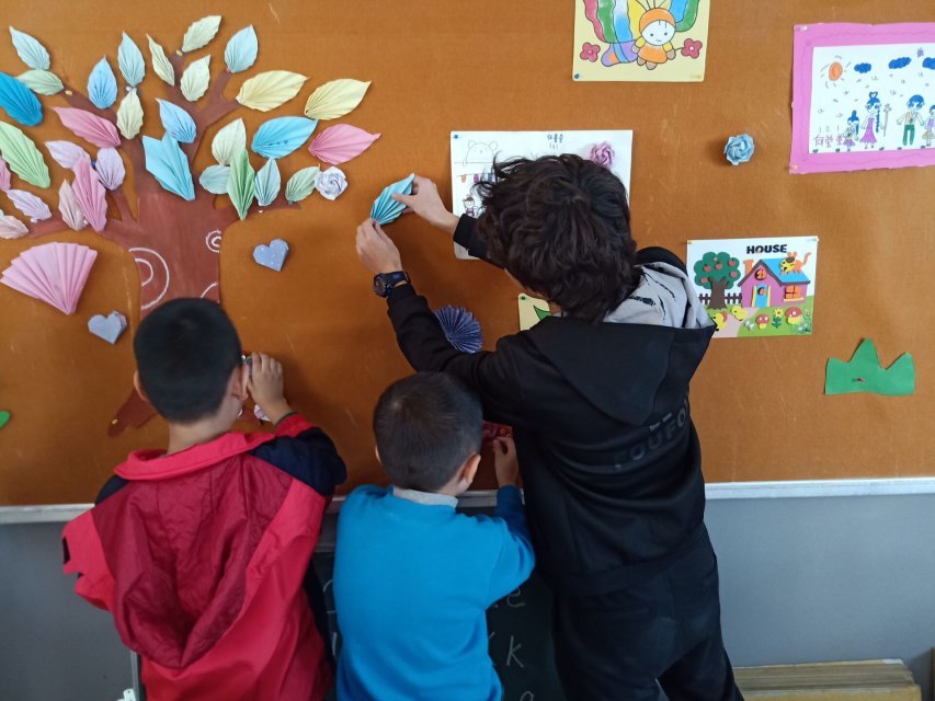 (图为孩子们和志愿者装饰教室 吴彤彤/摄)