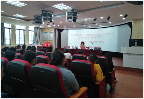 以及旅游管理、酒店管理的专业概况。与此同时,她结合自己教学中的实例,介绍自己学生的大学生各经验,提出大学是新的起点,要学会从小事做起,善于思考与总结,要认真学习,管理好自己的大学生生活。最后,她要求同学们要刻苦学习、博采众长、努力提高素质、开拓创新、培养创新、协作沟通能力和分辨能力。整个报告逻辑严谨,灵活有趣,不仅让同学们对旅管酒管专业有了深入的了解,还引导了新生培养积极上进、独立思考、潜心研究的学习态度。