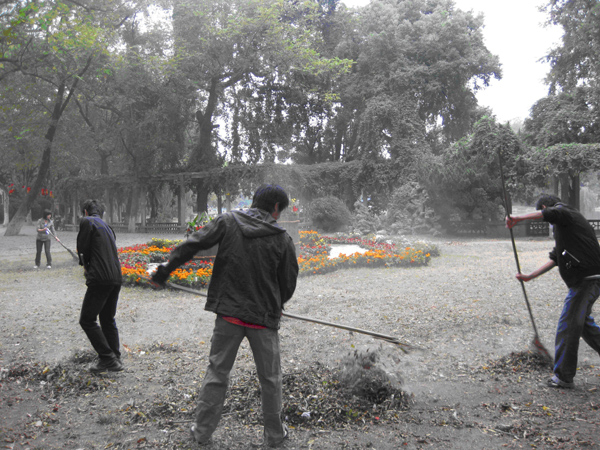 来到公园后,负责人将我们40名同学分成两组,第一组为30人,协助菱湖公园的工作人员美化公园的街道环境,第二组为10人,负责调研活动。