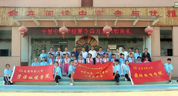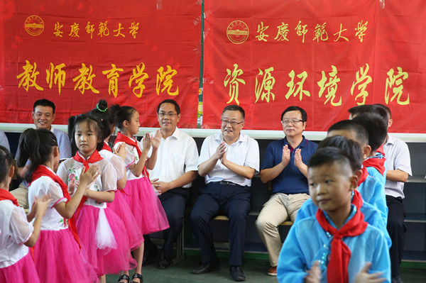 、教师教育学院有关负责人的陪同下,来到大观区十里中心学校,看望正在开展暑期“三下乡”社会实践活动的“心手相牵 阳光童行”志愿服务团师生,并给实践队员送去慰问品。大观区区委副书记、区长潘功发,区教育局、区团委和十里中心小学校长等领导也来到学校看望暑期实践学生。