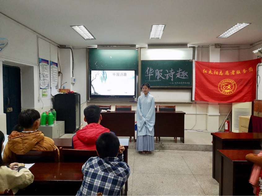 红太阳志愿者服务团前往依泽小学,和孩子们一起“穿越时空”,领略汉服之美和诗词之趣。