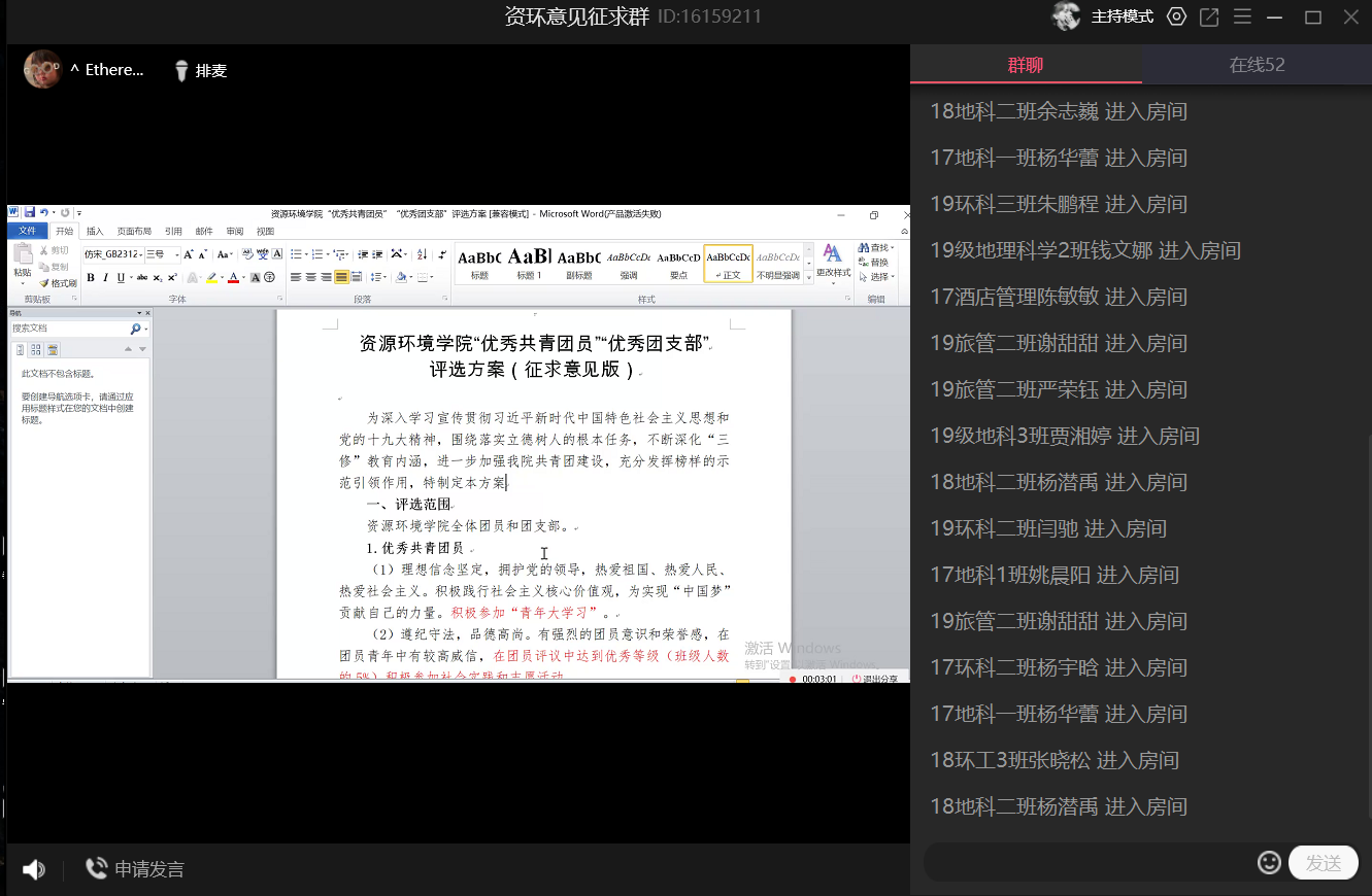 为了进一步规范团内评优工作,增强凝聚力,营造创优争先的良好学风,5月24日下午,学院团委组织召开了优秀共青团员、优秀团支部和先进班集体评选方案意见征求线上讨论会。2016—2019级各班学生代表等70余人参加。