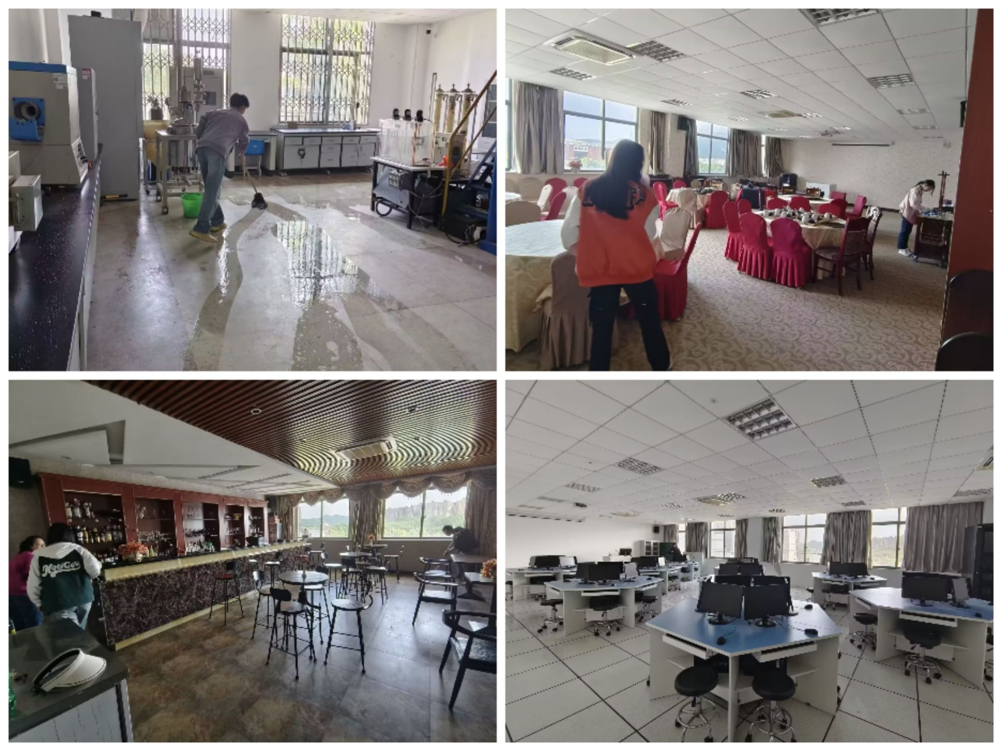 “这里还有垃圾。”“那里还需要擦。”“再拖一次吧。”……院学生会的生活部门在学院老师们的协助下带领志愿者们打扫学院学习区域,教室里来回奔波着忙碌的身影,学生们各司其职,积极认真的进行了打扫和清洁工作。