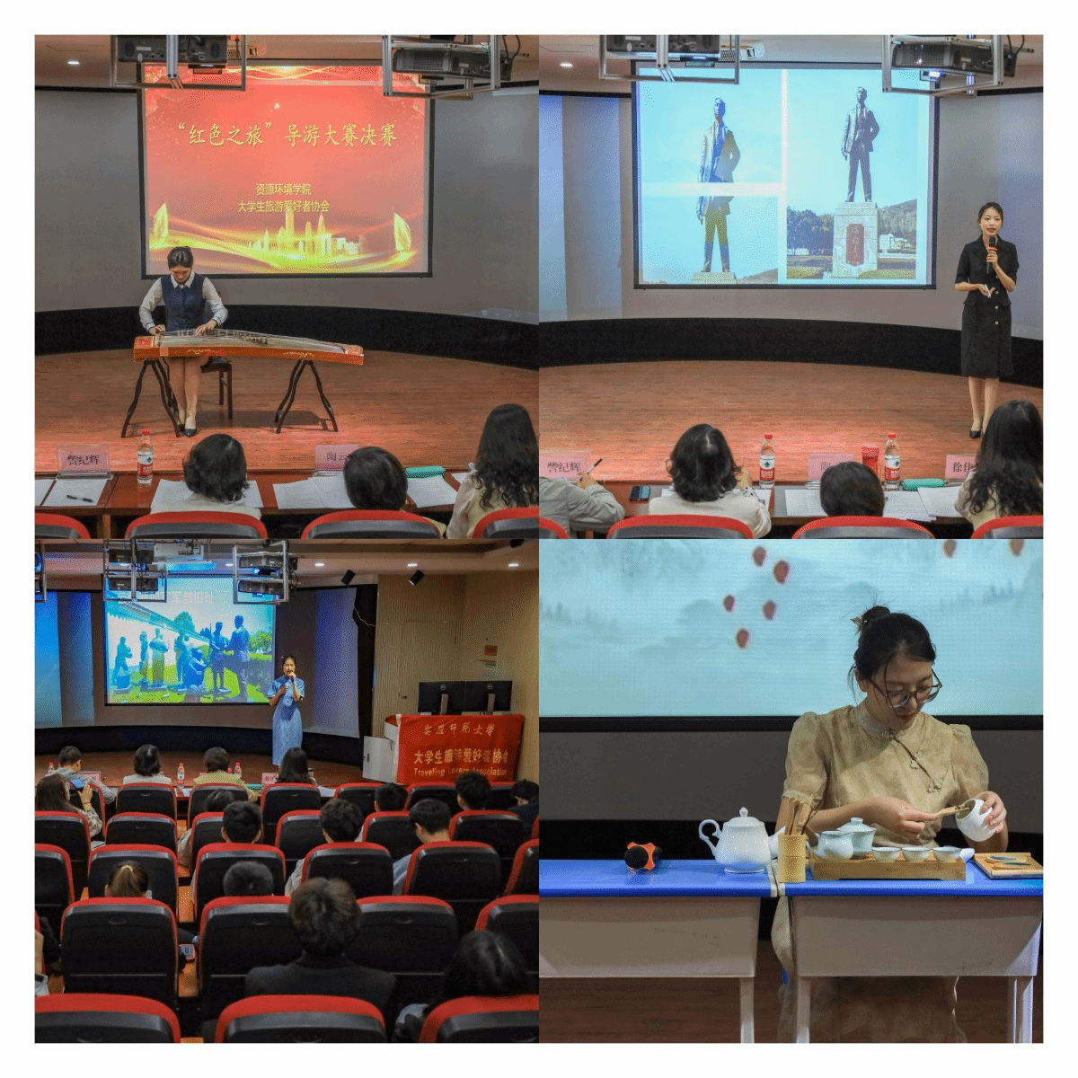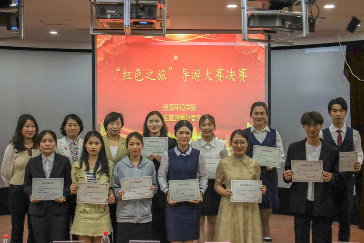 学生会与大学生旅游爱好者协会共同承办。参赛选手需从四个革命历史景点中选取其一,在8分钟内进行模拟导游讲解。此外,才艺展示与知识问答两个环节的表现情况也计入总分。