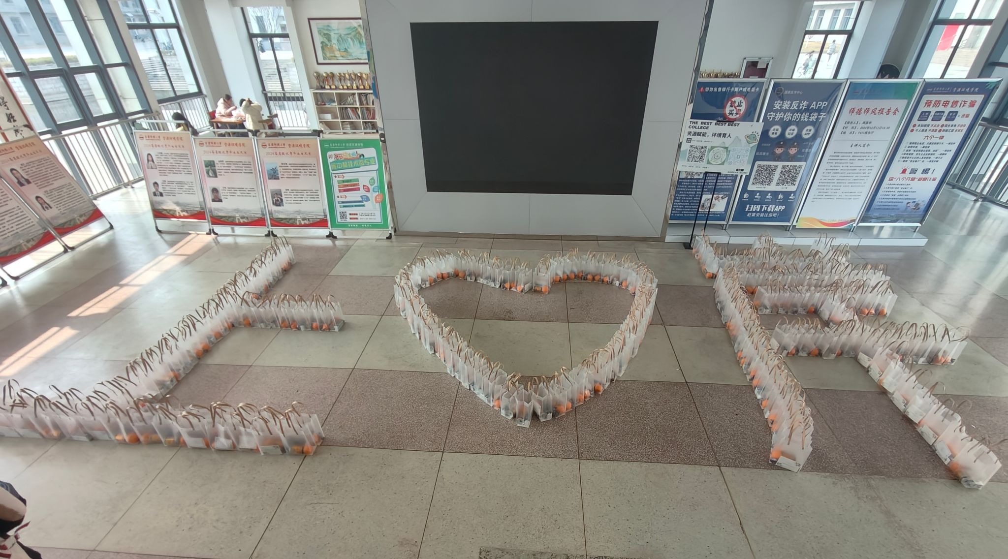 一楼大厅里,学院学生们用考研暖心礼包摆成“上岸”的字样,用行动为考研学子加油助威。