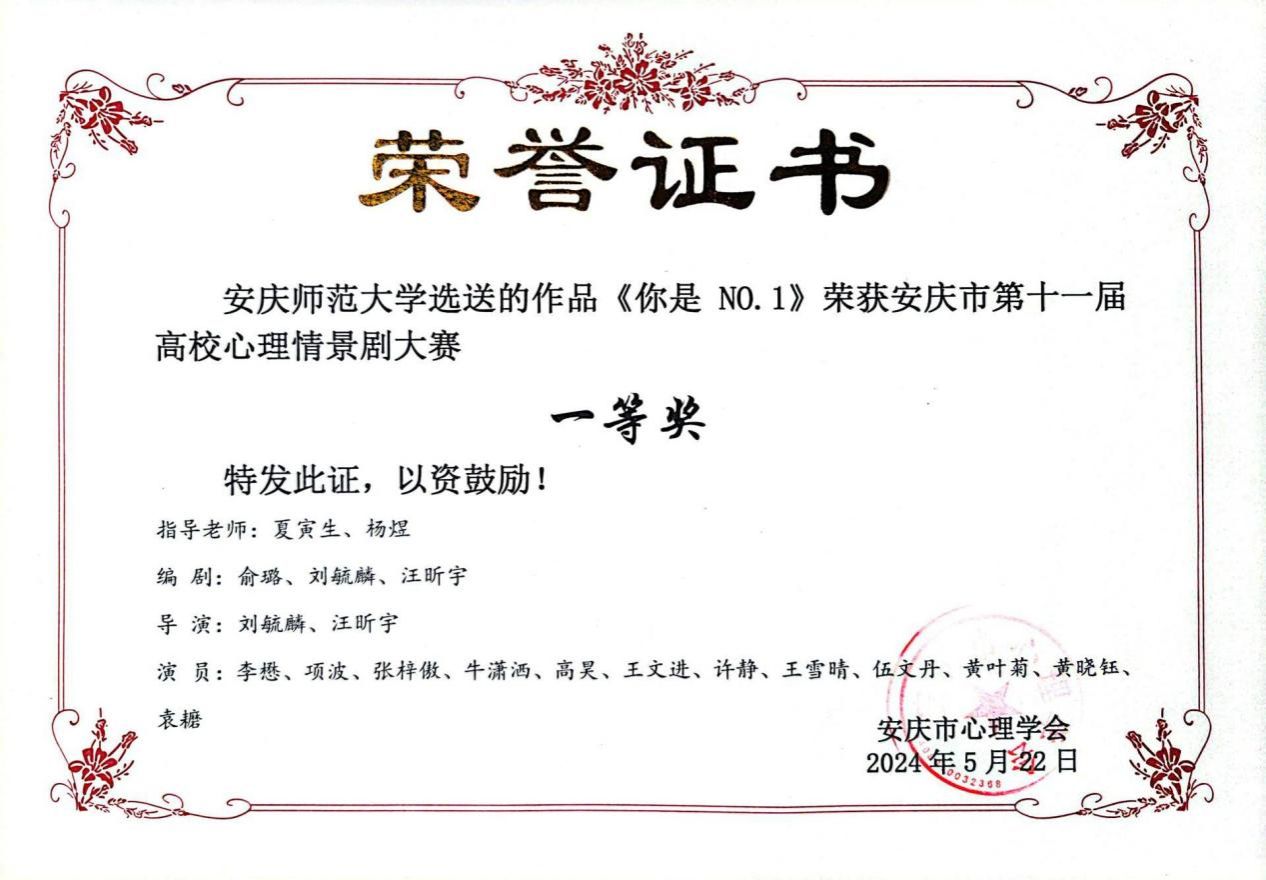向院话剧团荣获安庆市第十一届高校心理情景剧大赛一等奖再次表示由衷的祝贺!(撰稿:宋卓凡 审核:汪翘楚)