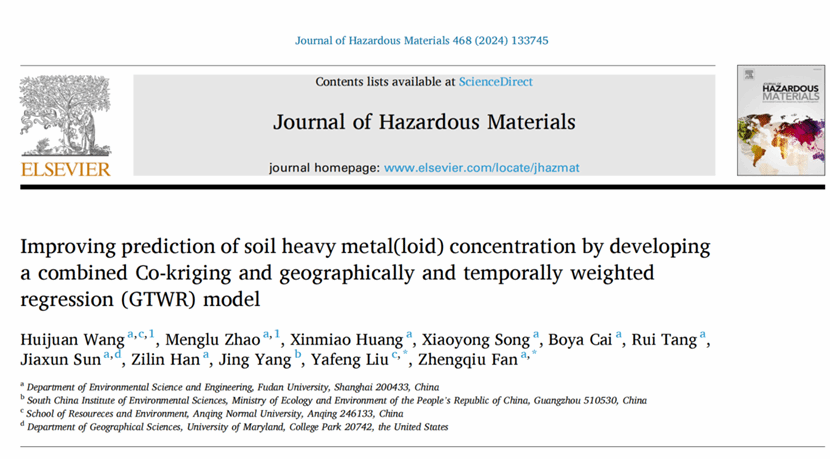 刘亚风副教授以共同通讯作者在环境领域著名期刊《Journal of Hazardous Materials》(中科院JCR分区1区,IF=13.6)上在线发表了关于大规模土壤重金属浓度预测的研究成果。