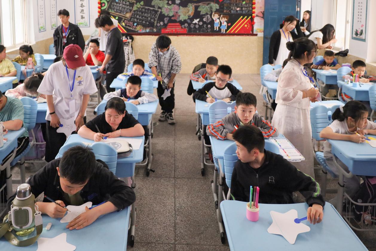 宣讲结束后,环境科学与工程类专业2024(2)班的胡恩泽拿出空白团扇,分发给围坐在一起的小朋友们。“大家可以把喜欢的历史人物形象或图案画在扇子上!”在胡恩泽的耐心引导下,Q版的鲁迅、李大钊、陈独秀以及不同的图案被学生们“复刻”在纸上。用笔尖先勾勒出图案的轮廓,再填充颜色、晕染色彩,五年级(2)班的韩雨茉不一会儿就完成了创作。“我画的是一颗五角星,是光明的象征。”韩雨茉举着扇子向朋友分享。