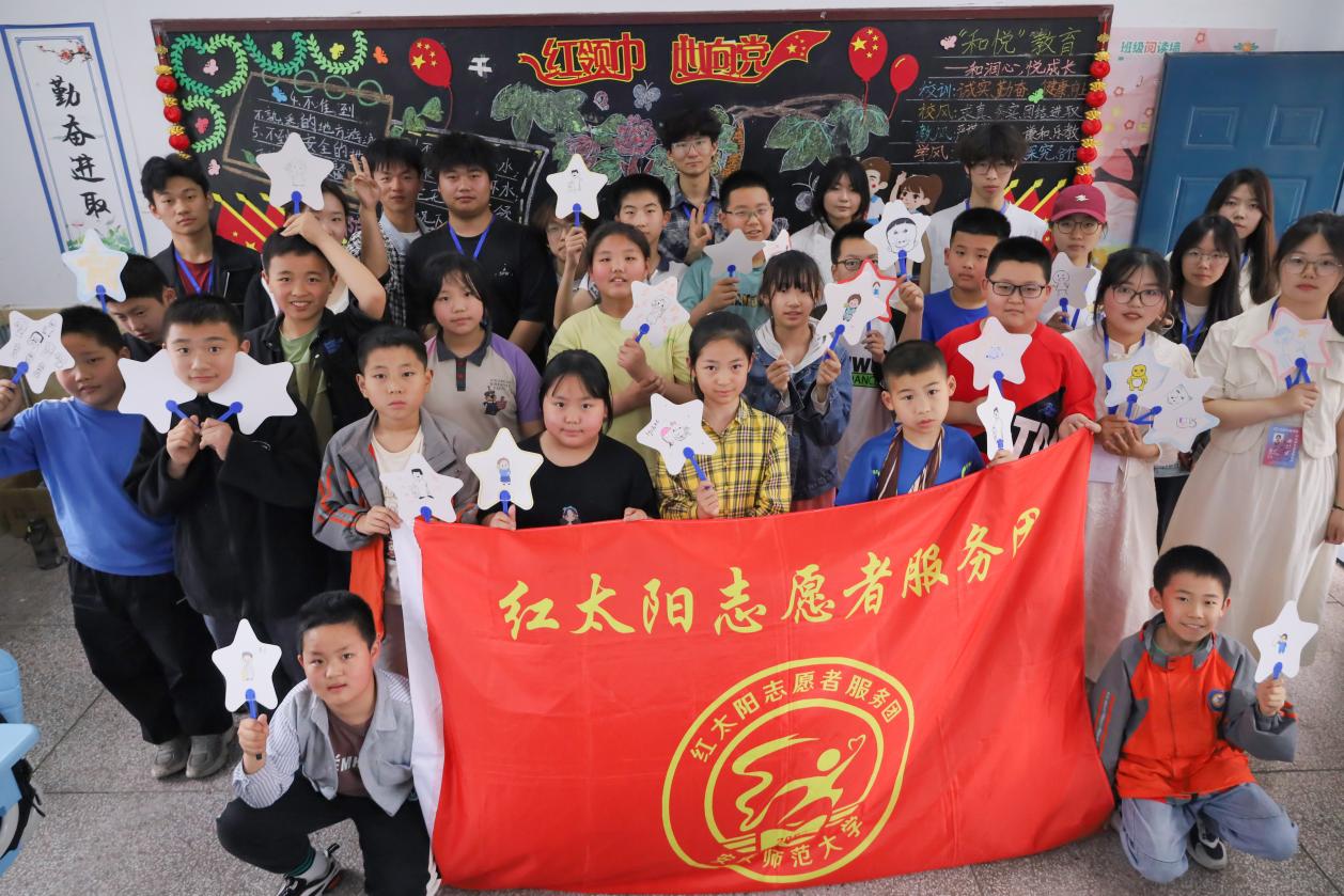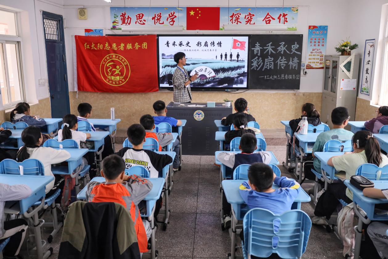 红太阳志愿者服务团的志愿者们走进安庆市依泽小学,化身“小老师”,带领小学生穿越百年时光,了解五四运动历史和五四精神。