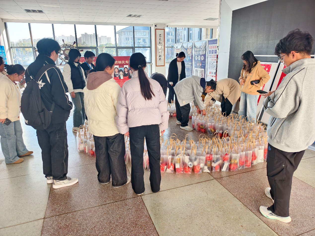 在学院一楼大厅组织考研助力活动。活动现场气氛热烈,秩序井然。橙子、饮料、独立包装的能量棒以及祝福贺卡等物资被分门别类,整齐摆放。一份份满载着鼓励与期待的“加油包”递到考研学子手中,承载着全院师生对他们的鼓励与期待。